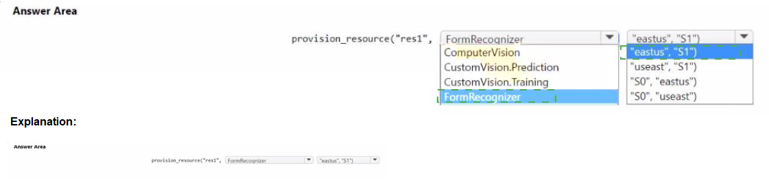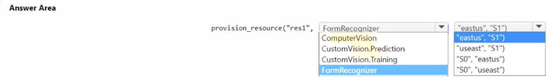 This selection is incorrect for the Form Recognizer service. The standard tier for Form Recognizer is "S0", not "S1". Furthermore, the location (region) and tier parameters are likely passed separately (location in the parameters object and tier as a method argument or within the Sku). This answer choice has the correct location ("eastus" is a valid region) but the wrong tier for the intended service, making it an incorrect pairing for the FormRecognizer kind.