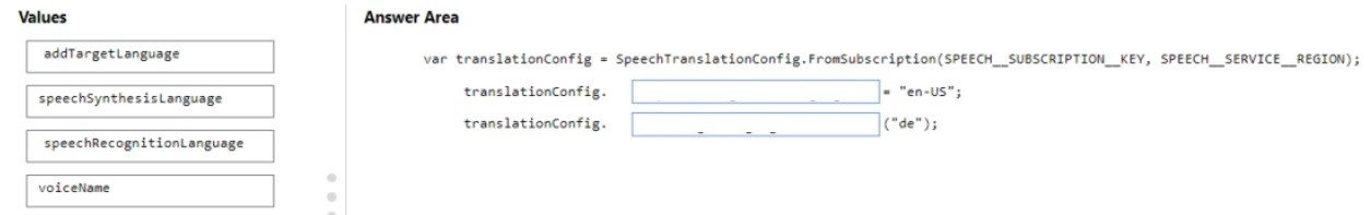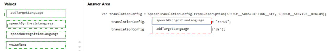 How should you complete the speechTransiationConf ig object? To answer, drag the appropriate values to the correct targets. Each value may be used once, more than once, or not at all. You may need to drag the split bar between panes or scroll to view content.