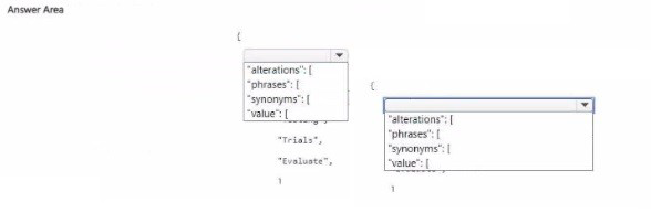 In custom question answering, synonyms (alternate phrasings) are defined within the alterations array. Each alteration contains a phrases array (synonyms) where you list alternative words or phrases that should be treated as equivalent (e.g., "testing", "T-rials", "Evaluate"). The value field is not used; the correct structure is phrases.
