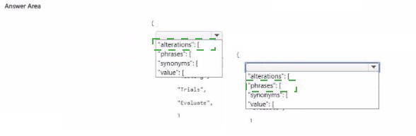 The phrases array holds the list of synonyms/alternatives. For example, "phrases": ["testing", "T-rials", "Evaluate"]. This tells the question answering service that these words are equivalent.