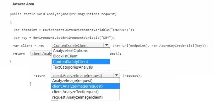 Second blank (return statement): client.AnalyzeImage(request)