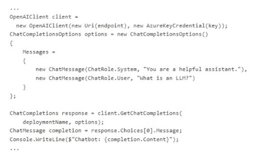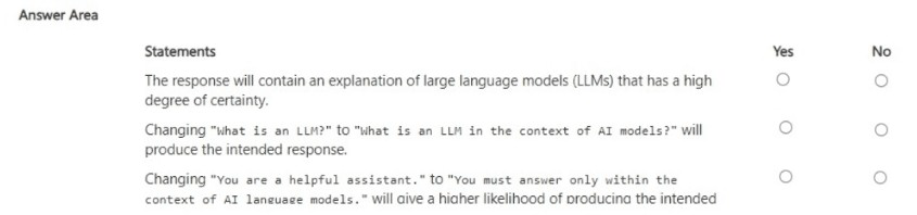 The code uses Azure OpenAI with a system message "You are a helpful assistant." and a user prompt "What is an LLM?". The model will likely return a definition of LLM (Large Language Model). However, there is no "high degree of certainty" guarantee. Changing the prompt to be more specific ("in the context of AI models") helps. Changing the system message to restrict context ("only within AI language models") also increases likelihood of relevant responses.