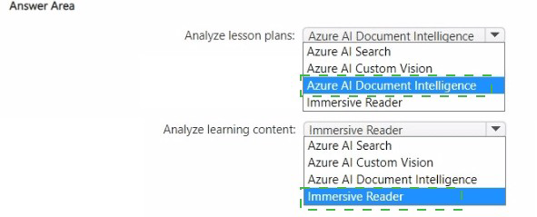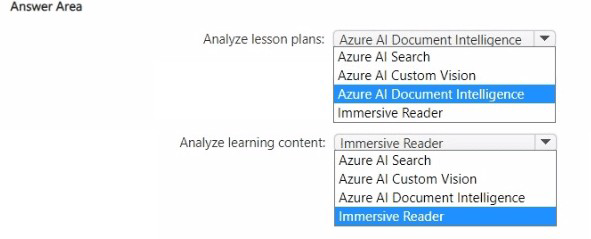 For extracting structured fields (lesson times, required texts) from lesson plans, Azure AI Document Intelligence provides pre-built models for forms and documents. For providing pictures representing words/phrases in text, Azure AI Custom Vision can be used to train a model to associate images with words, but that requires training. A better fit would be Azure AI Vision for image tagging, but since it's not an option, Immersive Reader is for readability, not picture association.
