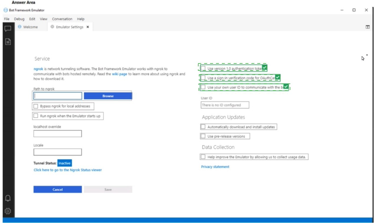 You need to test the bot by using the Bot Framework Emulator. The solution must ensure that you are prompted for credentials when you sign in to the bot.
