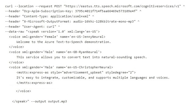 The cURL command sends an SSML (Speech Synthesis Markup Language) request to the Text-to-Speech API. The SSML defines three voice elements: JennyNeural (US female), RyanNeural (UK male), and ChristopherNeural (US male with "advertisement_upbeat" style). You will hear three distinct sentences, each in a different voice. Accents differ (US vs UK). The third sentence is not neutral; it uses an upbeat style.