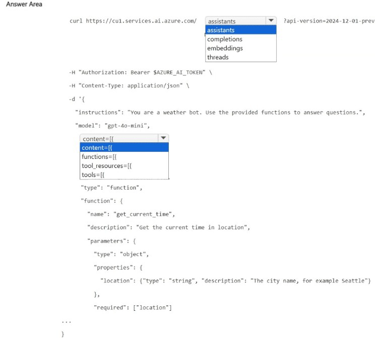 Microsoft Learn: "Azure AI Agent Service – Create assistant" – POST /assistants with tools array containing function definitions.