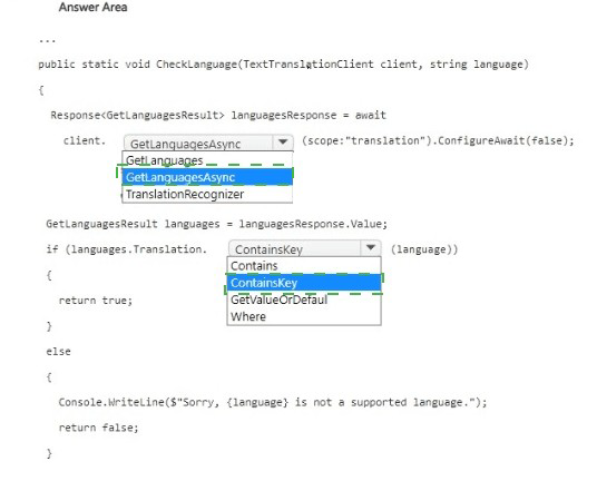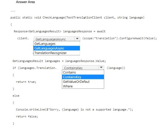 GetLanguages – If using synchronous SDK, this might be valid, but the code uses await and .ConfigureAwait(false), indicating asynchronous pattern. GetLanguagesAsync is correct.