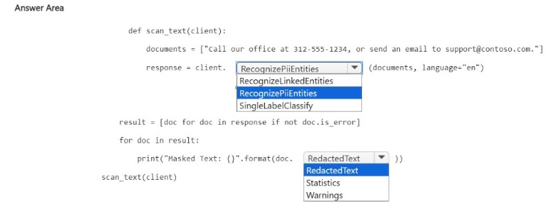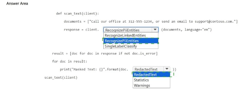 Microsoft Learn: "Text Analytics – PII redaction" – Use RecognizePiiEntities with redactText option or access RedactedText property.