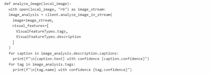 The code uses the Azure AI Vision client library to analyze an image from the local file system. It requests visual_features including tags and description. The code prints captions and tags with their confidence scores. It does not perform face recognition because VisualFeatureTypes.face was not requested.