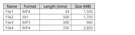 Azure Video Indexer supports video and audio files. It accepts common video formats (MP4, AVI, MOV, etc.) and audio formats (MP3, WAV, etc.). However, there is a maximum file size limit (typically around 30 GB or less depending on tier) and a maximum duration limit (currently up to 4 hours for indexing). Based on the table, File1 (34 min, 1.5 GB) and File3 (300 min MP3 audio) are acceptable. File2 (500 min AVI) and File4 (350 min MP4) exceed duration limits.