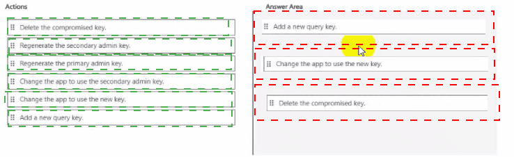 Azure Cognitive Search uses query keys for read-only access. If a query key is compromised, you must regenerate (which actually means delete and create a new) the query key. However, the options show "Regenerate the primary/secondary admin key" – but admin keys are for full access, not query keys. For a compromised query key, the correct action is to delete/regenerate that specific query key and update the app.