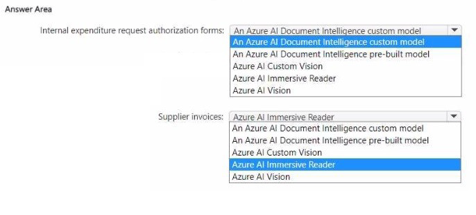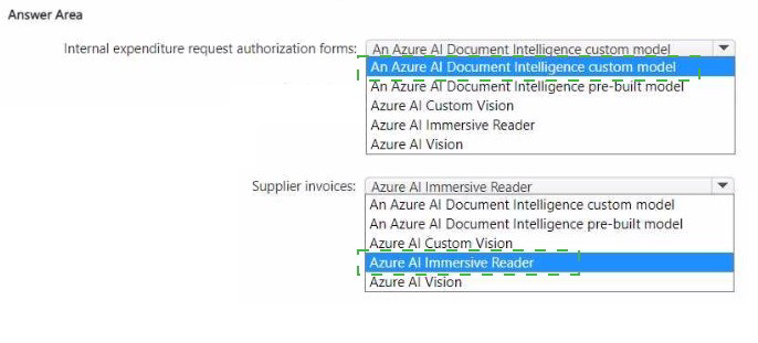 For supplier invoices, Document Intelligence provides a pre-built invoice model that extracts vendor name, customer details, line items, totals, and tax without training. For internal expenditure request authorization forms (custom forms unique to your company), a custom model is required because there is no pre-built model for proprietary internal forms.