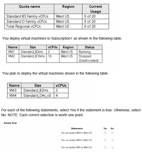 You have an Azure subscription named Subscription1 that contains the quotas shown in the following table.
