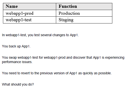 You have an Azure web app named App1. App1 has the deployment slots shown in the following table: