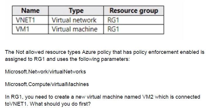 D. Remove Microsoft.Compute/virtualMachines from the policy.