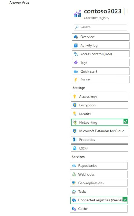 While selected in the exhibit, the Networking blade primarily handles public/private endpoint access, firewalls, virtual network integration, and dedicated data endpoints (available in Premium tier). It does not manage connected registries, which are a separate replication/sync feature. Selecting Networking alone won't enable or configure connected registry scenarios.