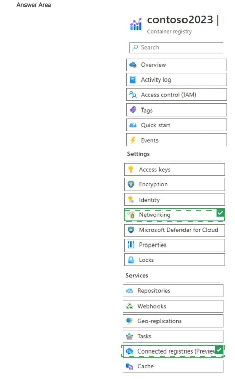 This is the correct blade/section because it is the dedicated location in the Azure portal for managing connected registry resources (in Preview at the time). Connected registries allow you to deploy a local/on-premises registry instance that synchronizes content (pull/push) with the cloud-based Azure Container Registry, improving performance for remote locations, reducing WAN traffic, and supporting scenarios like disconnected operations or edge computing. The exhibit highlights this under Services, confirming it's the entry point for configuration.