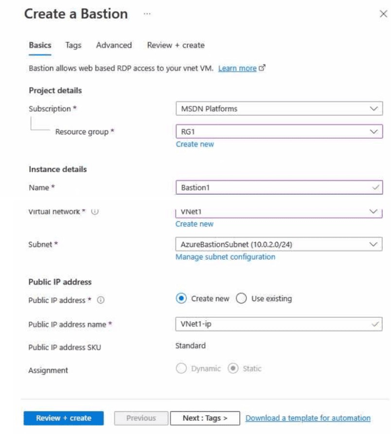 You create an Azure bastion for VNet1 as shown in the following exhibit