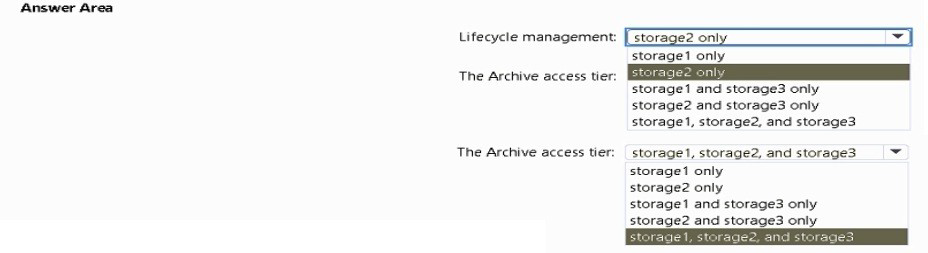You need to identify which storage accounts support lifecycle management, and which storage accounts support moving data to the Archive access tier. What should you identify