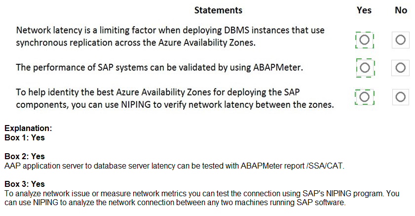 Statement 3: To help identify the best Azure Availability Zones for deploying the SAP components, you can use NIPING to verify network latency between the zones. → Yes