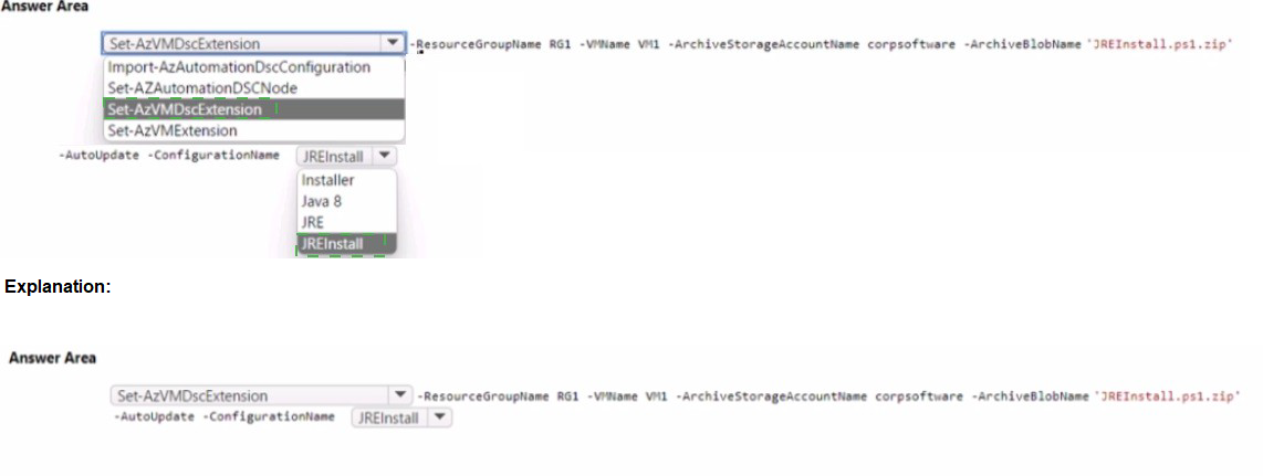 The exhibit shows the DSC configuration was published to corpsoftware storage account. The archive blob name must match the published file. Since the configuration block shows "Configuration JRE" and the question mentions publishing to corpsoftware, the archive name is JREInstall.ps1.zip, which contains the compiled MOF file(s) for the JRE configuration.