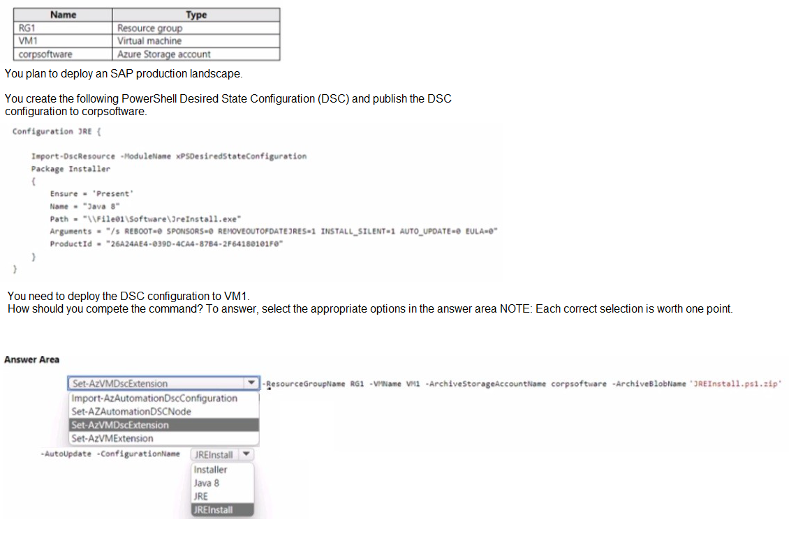 The scenario involves deploying a PowerShell DSC configuration to VM1 using a configuration published to the corpsoftware storage account. The command must properly reference the DSC extension, specify the archive location, and identify the correct configuration name from within the published .zip file. The configuration block shows the configuration is named "JRE" (from "Configuration JRE {"), and the archive is named "JREInstall.ps1.zip".