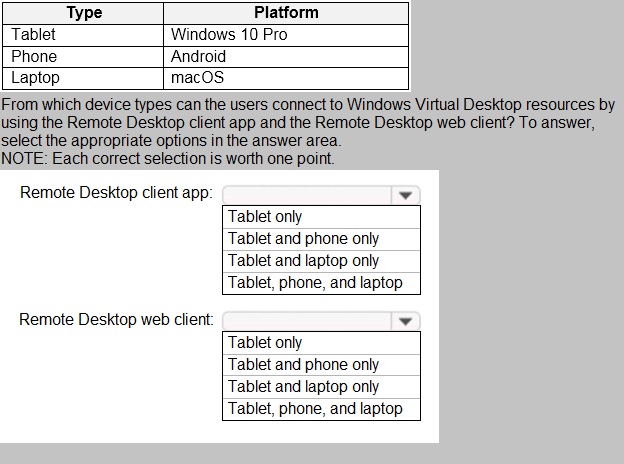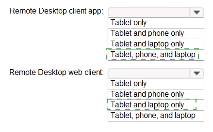This question tests your knowledge of client compatibility for Azure Virtual Desktop (formerly Windows Virtual Desktop). Different devices can connect using different client types. The Remote Desktop client app refers to the native installed application available for various platforms, while the Remote Desktop web client runs in a browser and has broader device compatibility but requires a supported browser.