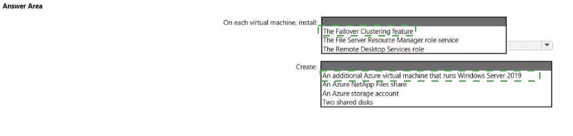 This question tests your knowledge of deploying Storage Spaces Direct (S2D) as a Scale-Out File Server (SOFS) for FSLogix user profiles in Azure Virtual Desktop. Storage Spaces Direct requires specific features and components to function properly as a highly available file share. The solution must ensure profile availability if a single server fails (high availability) while minimizing administrative effort. This requires the correct features installed and the appropriate shared storage configuration.