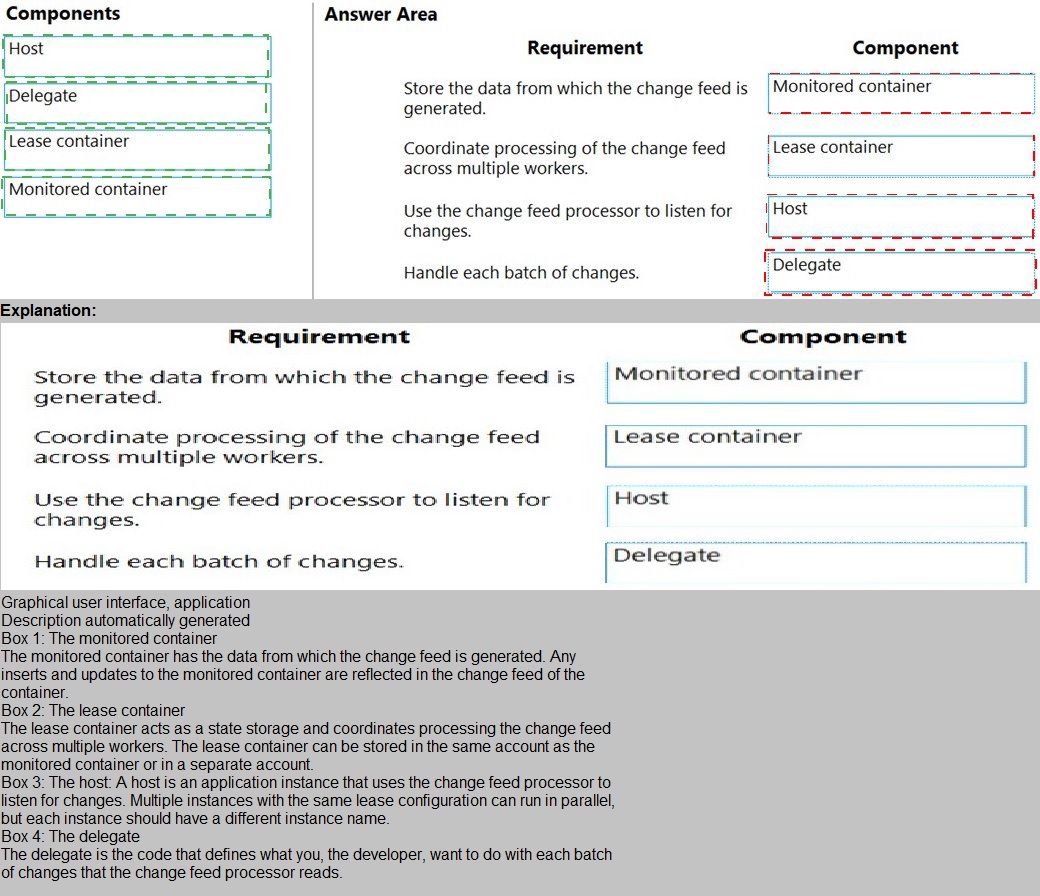 This question tests your knowledge of change feed processing options in Azure Cosmos DB using the latest SDK. The requirements include immediate change processing, parallelization, and sending operations to Blob Storage. Both Azure Functions Cosmos DB trigger (push model) and change feed pull model with FeedIterator/FeedRange are valid, production-ready solutions for consuming the change feed across multiple partitions and workers.