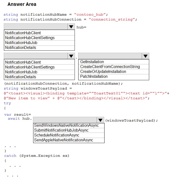 A notification must arrive on a user's device when there is a new article available for them to view. You need to implement push notifications. How should you complete the code segment? To answer, select the appropriate options in the answer area. NOTE: Each correct selection is worth one point.