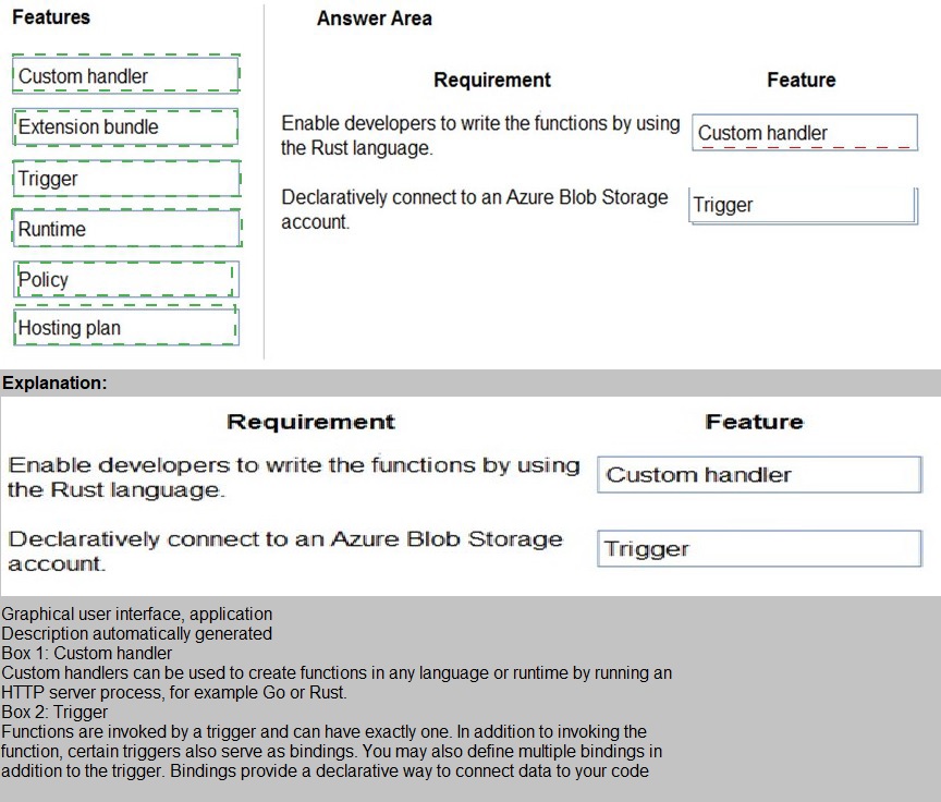Which Azure Function app features should you use? To answer, drag the appropriate