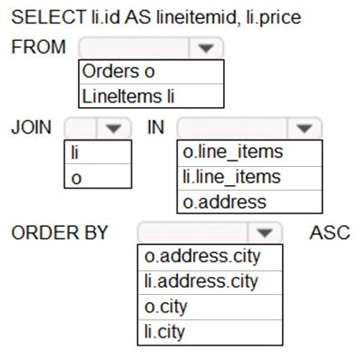 You need to retrieve all order line items from Order.json and sort the data alphabetically by the city. How should you complete the code? To answer, select the appropriate options in the answer area. NOTE: Each correct selection is worth one point.