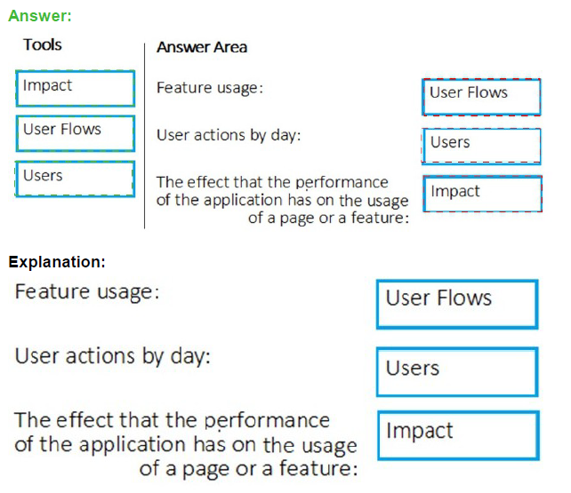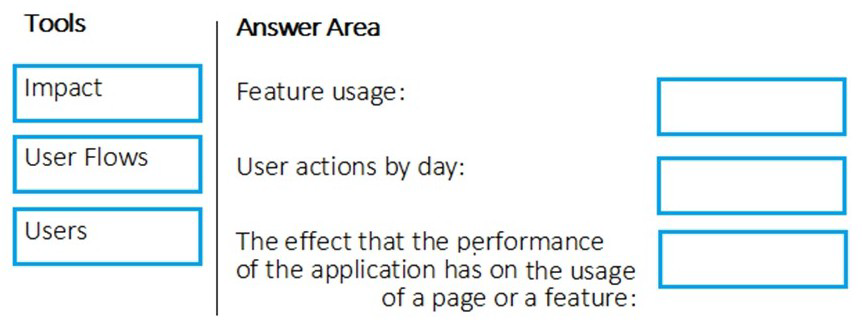 Which application Insights tool should you use to analyze each behavior? To answer, drag the appropriate tools to the correct behaviors. Each tool may be used once, more than once, or not at all. You may need to drag the split bar between panes or scroll to view content.