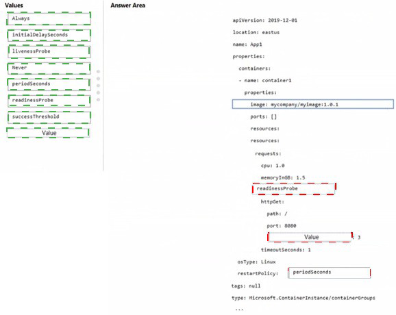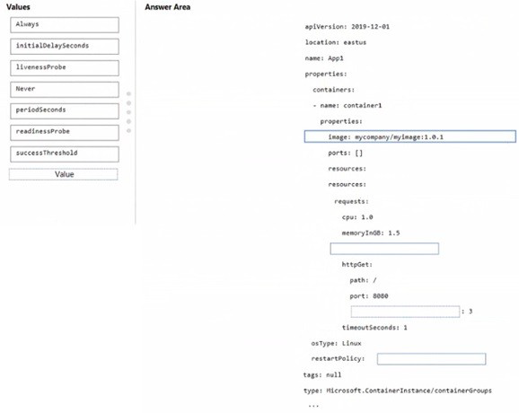 You need to configure the AKS container to restart automatically if the container stops responding. The solution must check the status of App1 once every three seconds.