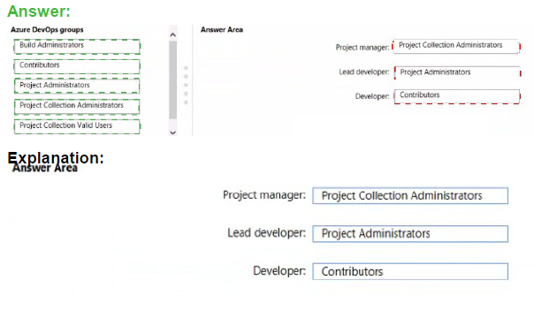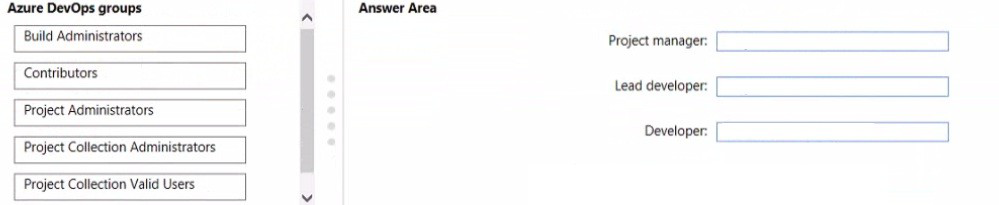 To which Azure DevOps groups should you add each team? To answer, drag the appropriate groups to the correct teams. Each group may be used once, more than once, or not at all. You may need to drag the split bar between panes or scroll to view content.