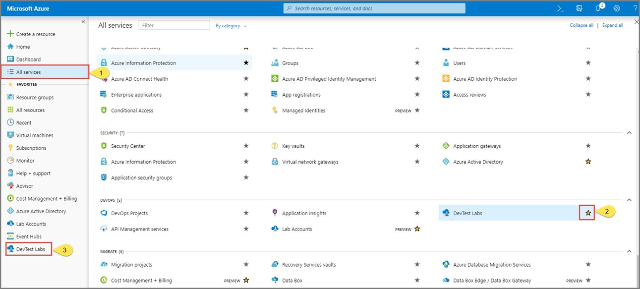 2. Select All Services, and then select DevTest Labs in the DEVOPS section.