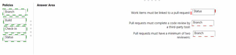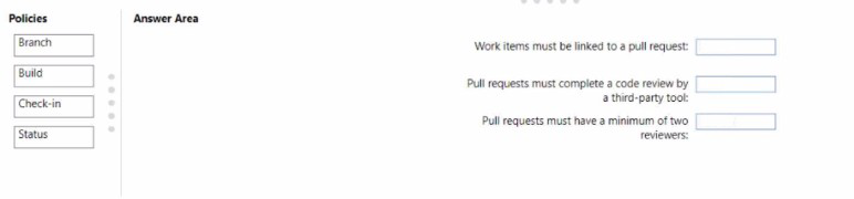 Azure Repos provides branch policies to enforce code quality and collaboration standards. Different policy types address specific requirements: work item linking, reviewer count, and integration with external tools. Selecting the appropriate policy type for each requirement ensures compliance while minimizing manual administrative overhead.