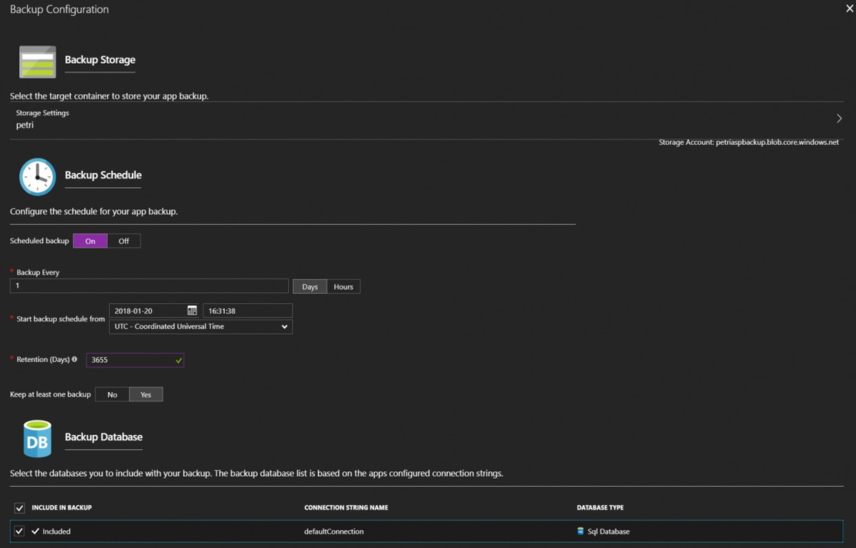 Backups include your web app content, configuration, and any connected databases (if configured)