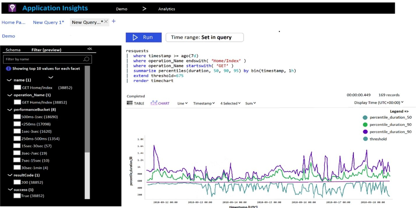 The Application Insights query analyzes request performance for the "GET Home/Index" operation over the past 7 days. It calculates the 50th, 90th, and 95th percentile durations hourly and compares them against a threshold of 675ms. The schema panel shows that 38,852 requests were analyzed, with most completing between <250ms and 1 second.