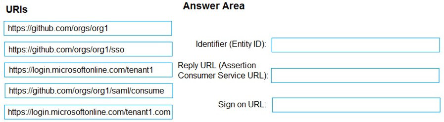 When configuring SAML-based SSO between Azure AD (as the identity provider) and GitHub (as the service provider), specific URIs must be configured correctly. The Identifier (Entity ID) uniquely identifies the application in Azure AD, the Reply URL is where Azure AD sends SAML responses after authentication, and the Sign-on URL is where users initiate the login process.