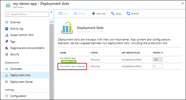on the Deployment slots page. By default, Traffic % is set to 0 for the new slot, with all