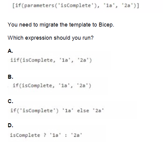 Bicep uses the ternary operator syntax condition ? true-value : false-value for conditional expressions. This is the correct Bicep equivalent of the ARM template if() function. The parameter isComplete is referenced directly by name, and the ternary operator returns '1a' when true and '2a' when false, exactly matching the original ARM template logic.