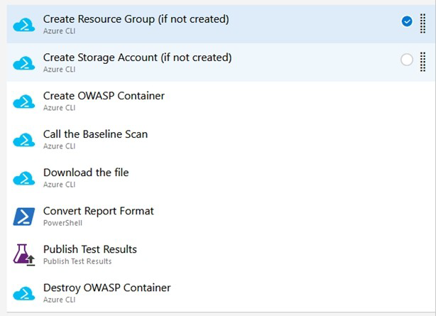 Once the application portion of the Release pipeline has been configured, the security scan portion can be defined. In our example, this consists of 8 tasks, primarily using the Azure