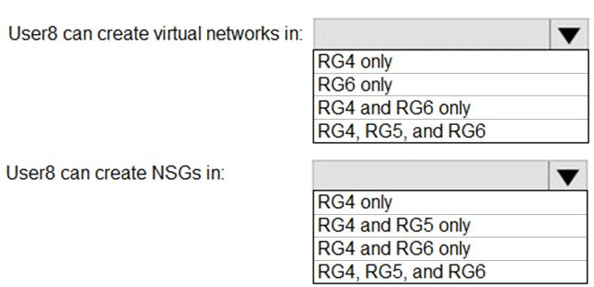 In which resource groups can User8 create virtual networks and NSGs? To answer, select