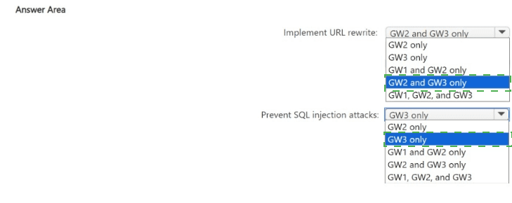 GW2 only / GW1 and GW2 only / GW2 and GW3 only / GW1, GW2, and GW3 – Incorrect because only the WAF SKU (GW3) provides SQL injection prevention via WAF rulesets.