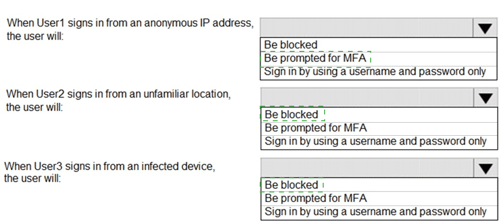 User3 is in Group1 and not excluded. A sign-in from an infected device typically triggers High sign-in risk. Since the policy applies to Medium and above, this will require MFA. Again, User3’s per-user MFA status does not override the risk-based MFA requirement.