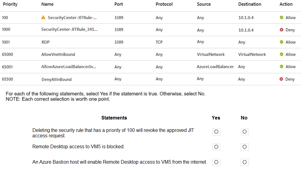 RDP access to VM5 is blocked: Yes – Without an active JIT request, the Deny rule (1000) blocks RDP, since JIT allows only from requested IP, not any IP.