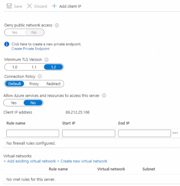 However, given VM1 has only a private IP and “Deny public network access” is currently Yes, technically VM1 cannot connect publicly at all. Yet, the question’s expected answer often assumes you must first allow VM1's IP via a firewall rule if public access is allowed — but here public access is denied, so the real solution would be a private endpoint. But since that’s not an option, and among given choices, “create a new firewall rule” is the standard exam answer for allowing a VM to connect when firewall rules are empty.