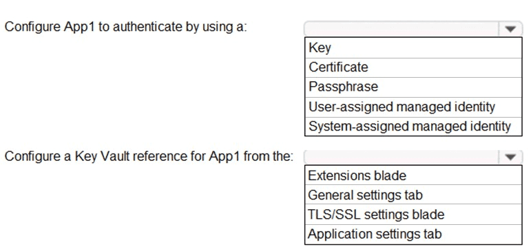 How should you configure App1? To answer, select the appropriate options in the answer