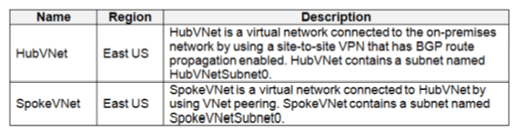 You need to ensure that traffic between SpokeVNetSubnet0 and the on-premises network
